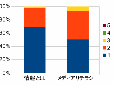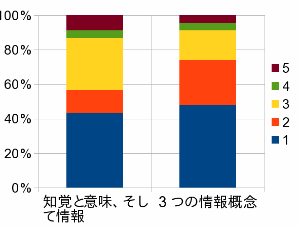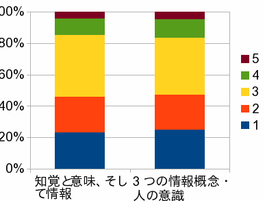 どちらの授業も40%以上の生徒が概ね理解したと回答している。授業内容と時間数さらに生徒の学力レベルを考えると、記名調査であることを差し引いたとしても、非常に高い値である。ただ、理解度を低く申告した生徒でも、的確なコメントを書いている場合が多数見受けられる。したがって、自己申告のデータを鵜呑みにすることは性急であると思われる。 この2つの授業及びこれに続く「基礎情報学」に関する授業が生徒に対して強いインパクトを与えていることはYouTubeで公開している『生命と機械をつなぐ授業』ビデオからもうかがうことができる。 |
